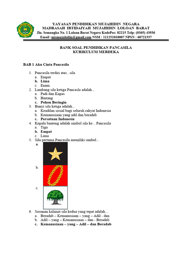 Jawaban: Sila Pertama.Penjelasan untuk Bagian D: Soal uraian singkat ini dirancang untuk melihat sejauh mana siswa dapat mengekspresikan pemahamannya secara lisan atau tulisan sederhana. Ini melatih kemampuan komunikasi dan penalaran dasar mereka.